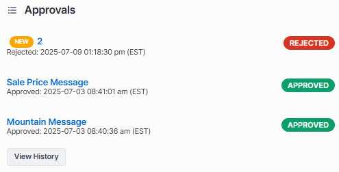 Clicking the reject button will add a notification to the submitter's approvals area indicating that their message was rejected.